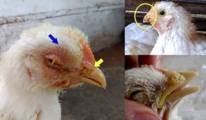 - اصوات تنفسية غريبة و من الممكن ان نلاحظ أصوات على شكل صرخة مع مد رقبته للأعلى للتنفس ناتجة عن صعوبة في التنفس (و يجب تميزها عن الاصابة بالتهاب الحنجرة و الرغامى المعدي – ILT).
