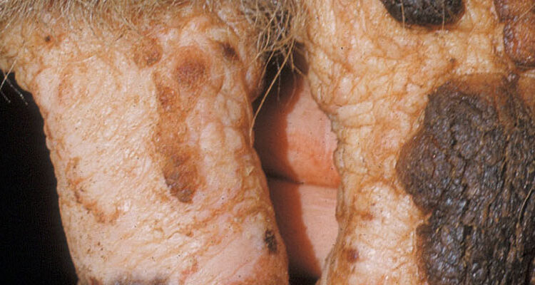 اما في الثيران فتشاهد الآفات على الصفن و يمكن ان تظهر الآفات في العجول الرضيعة حول الفم.